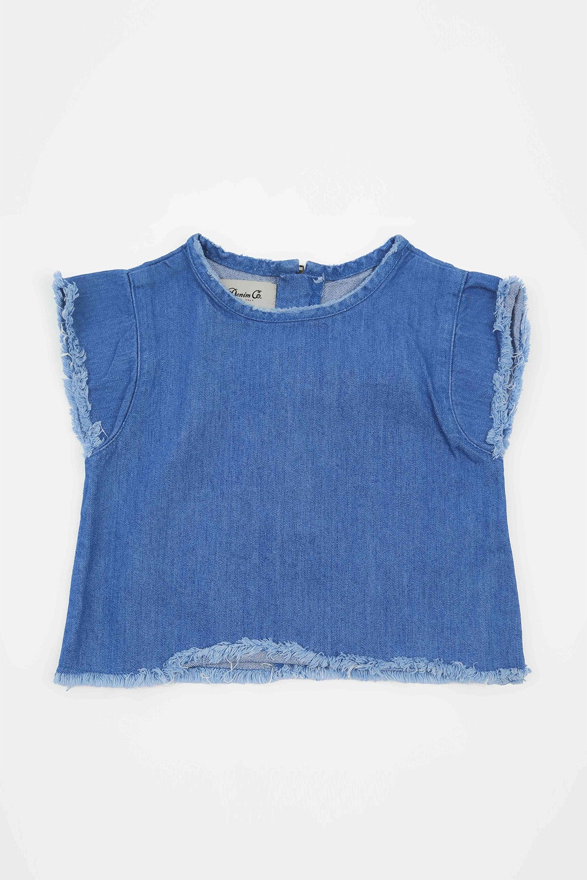 Our cropped denim top is perfect for the fashion-forward girl. Crafted from soft, stretchy denim, this stylish piece offers both comfort and style.