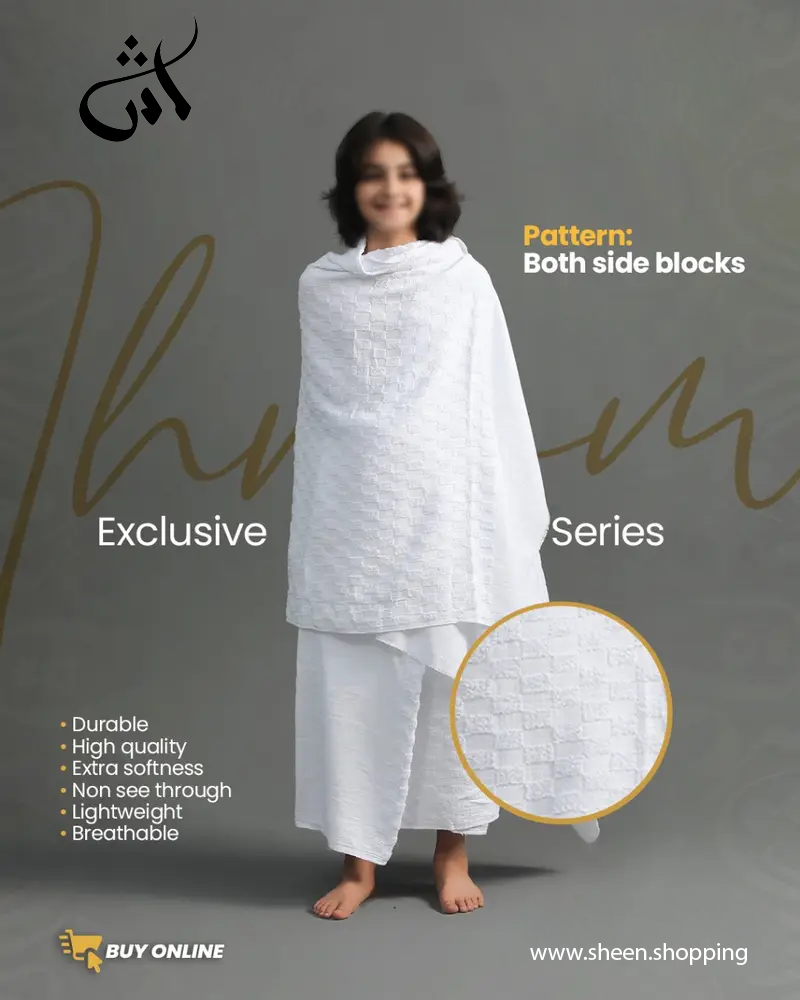 Make your child’s pilgrimage journey comfortable with our Kids’ Towel Ihram (Size: 35 × 70 inches), specially designed by Sheen store. Crafted from soft, absorbent towel fabric, it ensures comfort throughout Hajj or Umrah.