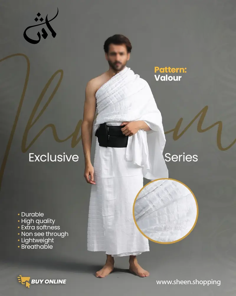 Sheen store proudly presents the Ihram Cotton VIP, designed with premium-grade cotton to provide a luxurious and comfortable experience for pilgrims during Hajj and Umrah.